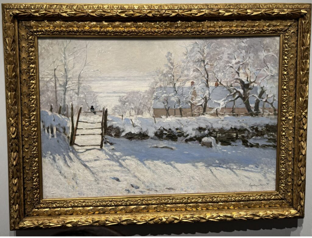 実際、展覧会の解説でも、桃色や紫がかった葉、青みを帯びた灰色の垣根、そして影の黒…といった“白以外”の色が雪の中に散りばめられていることが語られていて、モネの探求がすごくわかりやすいです。