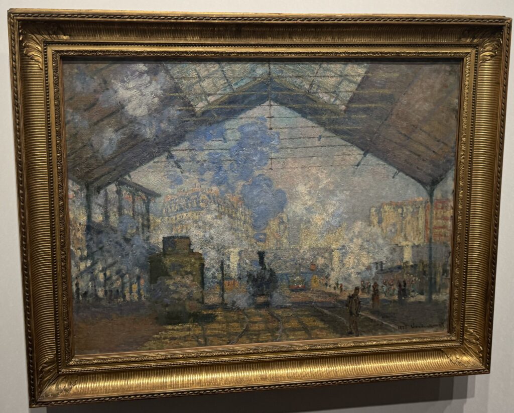 蒸気、鉄骨、ガラス屋根、そして人の流れ。いかにも“現代生活”の塊なのに、モネの手にかかると、ただの記録じゃなくて「光の場」になる。