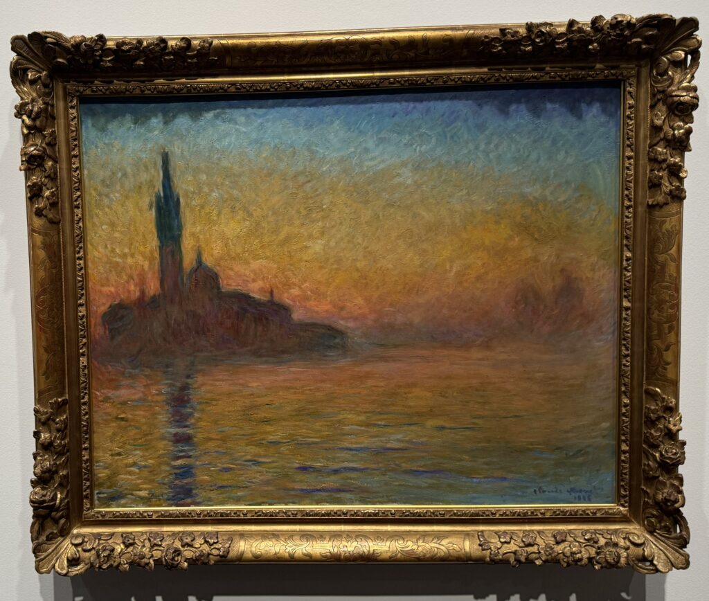 この絵の魅力は、建物や空の形がすごいとか、描写が正確とか、そういう方向ではなく、輪郭はほどけて、空気と水面と光が溶け合い、その代わりに残っている「時間」が魅力です。黄昏って、見ているあいだにも色が変わりますが、あの“変化そのもの”がキャンバスの上にある感じがしました。