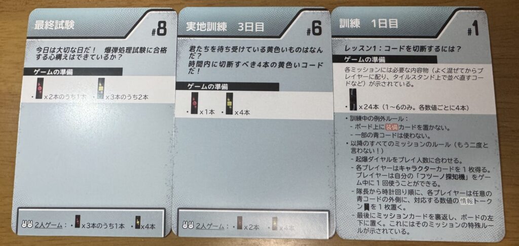 ボムバスターズを遊んでいて良いと思ったのは、1回遊んで終わりではなく、まだまだ違うルール遊べるところです。今回はチュートリアル寄りのミッション#1、#6、#8を遊びましたが、こちらは多少難易度が上がる感じでしたが、本作は、ミッションが66個あり、他のミッションを見てみると今回のルールでは使っていないものを使うミッションがあり、ミッションごとに考え方や緊張感に変化がありそうで、またやりたいと思う作りになっていました。